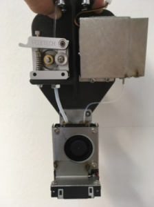Zum Testen von 3D Druckparameter wurde der Druckkopf in einen 3D-Plotter der Fa. Velleman eingebaut – siehe Abbildungen oben – der Einbau in einen 6-achsen Roboter ist innerhalb des Projektes MMO3D in der Entwicklung (Abschluss August 2019).