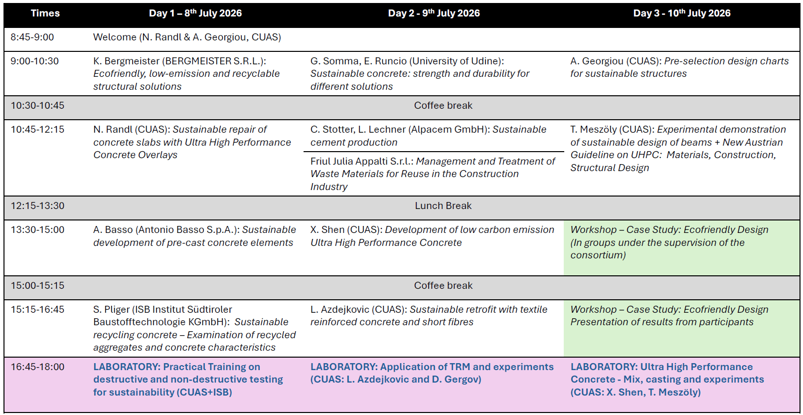 The Summer School on Practices in Construction is a unique program for students and industry professionals who want to help shape the future of sustainable construction. This intensive three-day program combines lectures from experts, hands-on lab exercises and real-world case studies from leading companies and institutions. Participants will explore hot topics such as low-carbon cement alternatives, ultra high-strength concrete, sustainable structural design and advanced materials for repairs and retrofits. This summer school is organized in collaboration with partners from academia and industry and places a special focus on innovative eco-efficient structural solutions. It provides a powerful platform to deepen your expertise, expand your network and contribute to the green transition in construction.